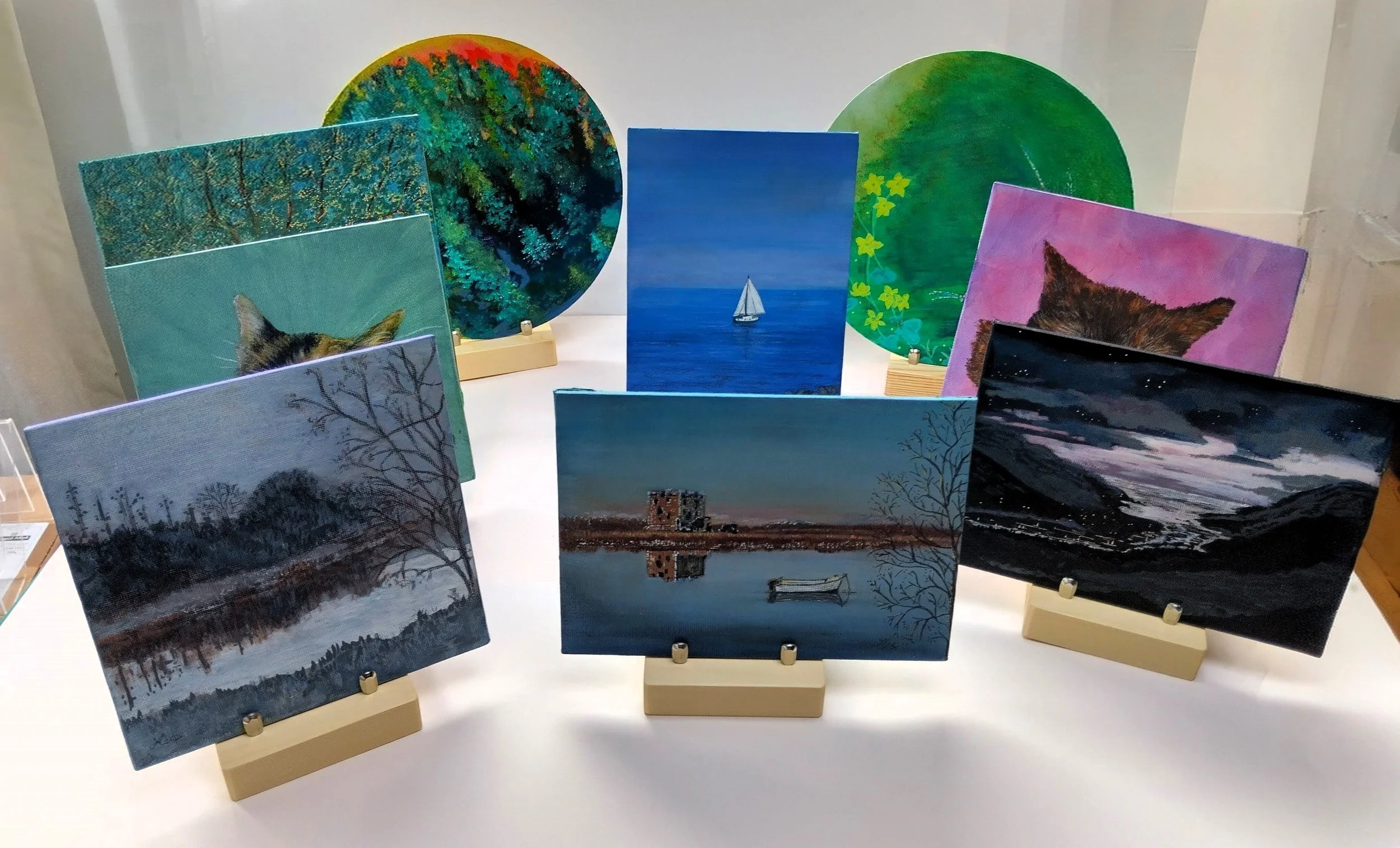My small original paintings have had a bit of an upgrade! I’ve just had a delivery of a new style of wooden stand for them, and I must admit I’m rather pleased with how they look.